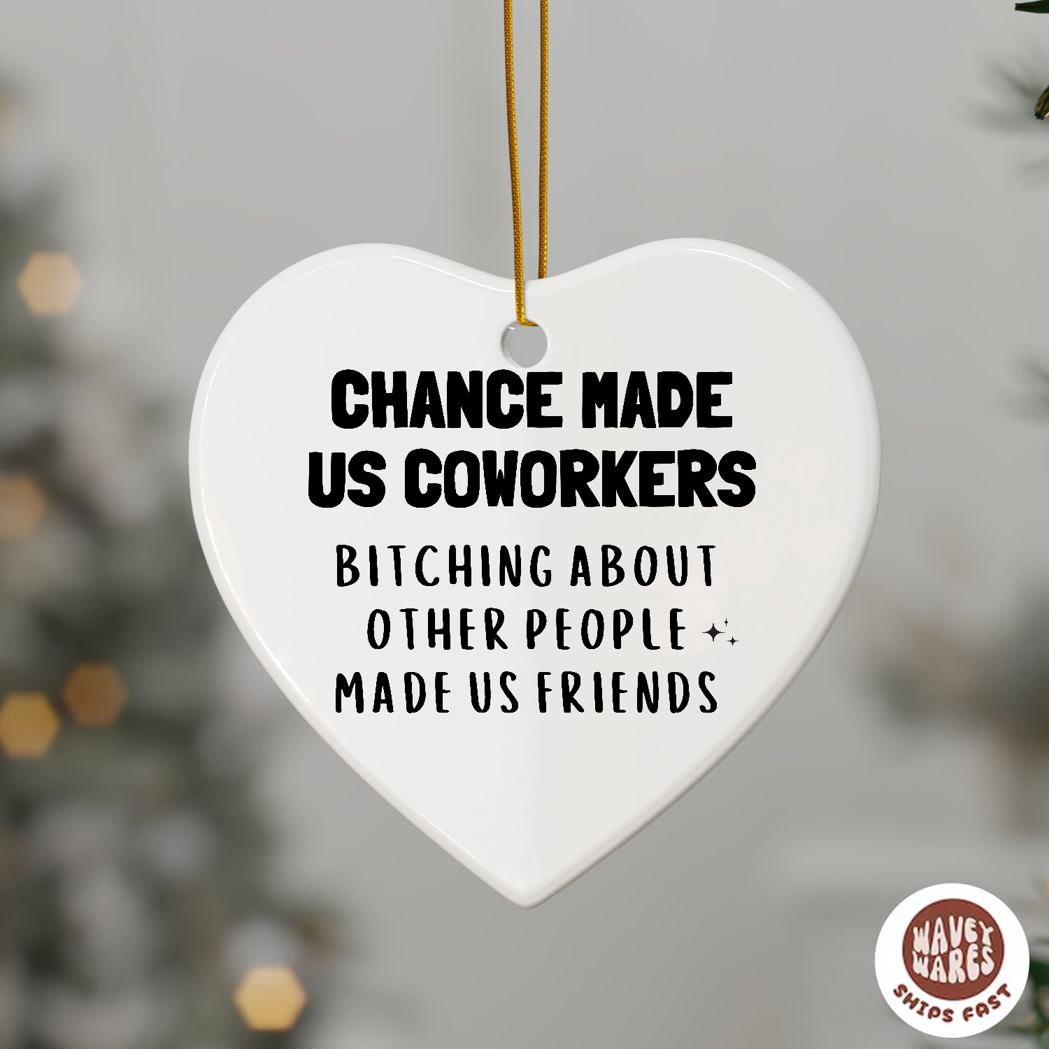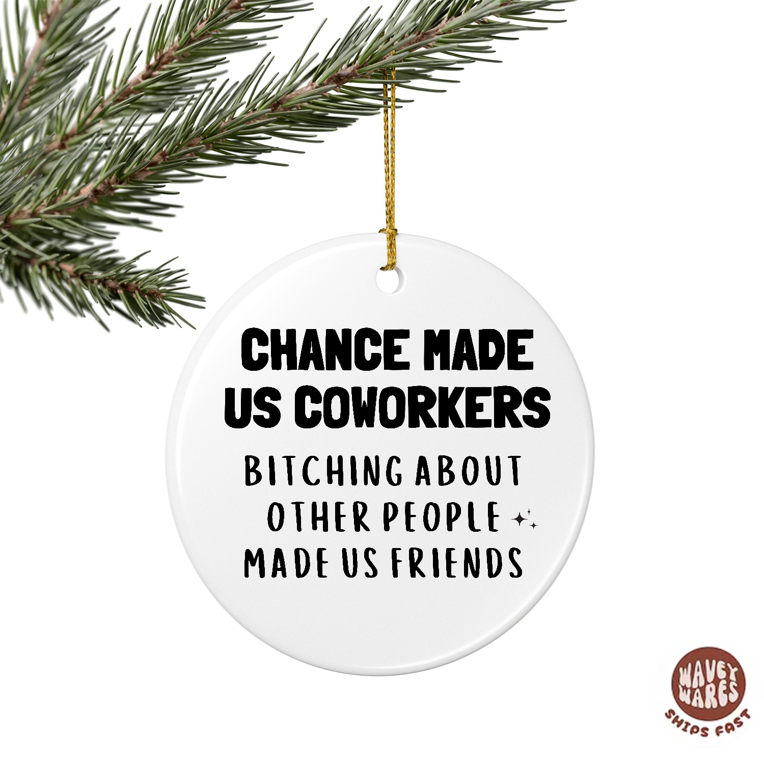 Celebrate the hilarious bond you've built at work with this cheeky ornament that perfectly captures office friendships. Featuring a witty message about how complaining together creates the strongest workplace connections, it's the ideal gift for your boss, colleague, or team member. Whether hanging on a Christmas tree or displayed year-round, this humorous keepsake brings a smile to anyone who's ever bonded over shared workplace frustrations. Perfect for birthdays, holidays, or just because - a fun reminder that the best coworkers are the ones who get it.