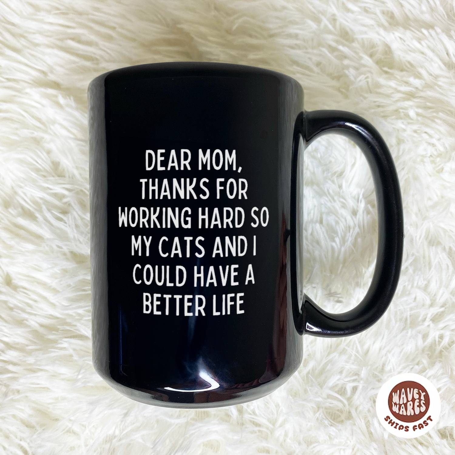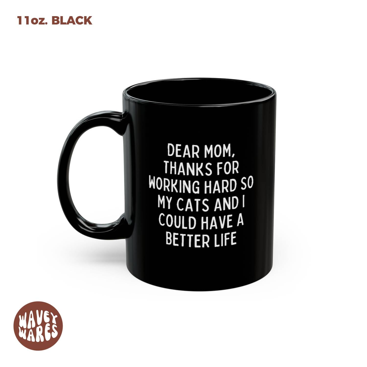 Dear Mom, Thanks For Working Hard So My Cats And I Could Have A Better Life Black Mug