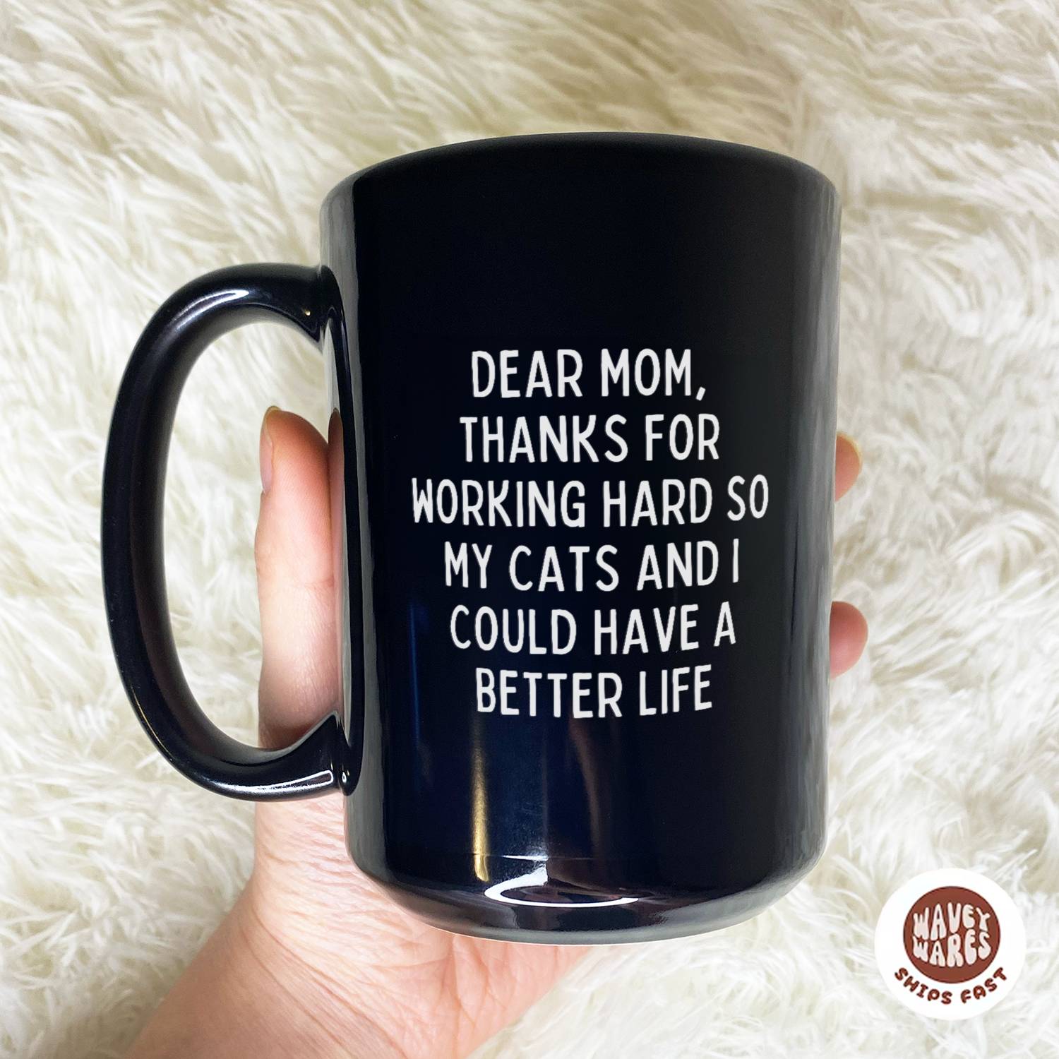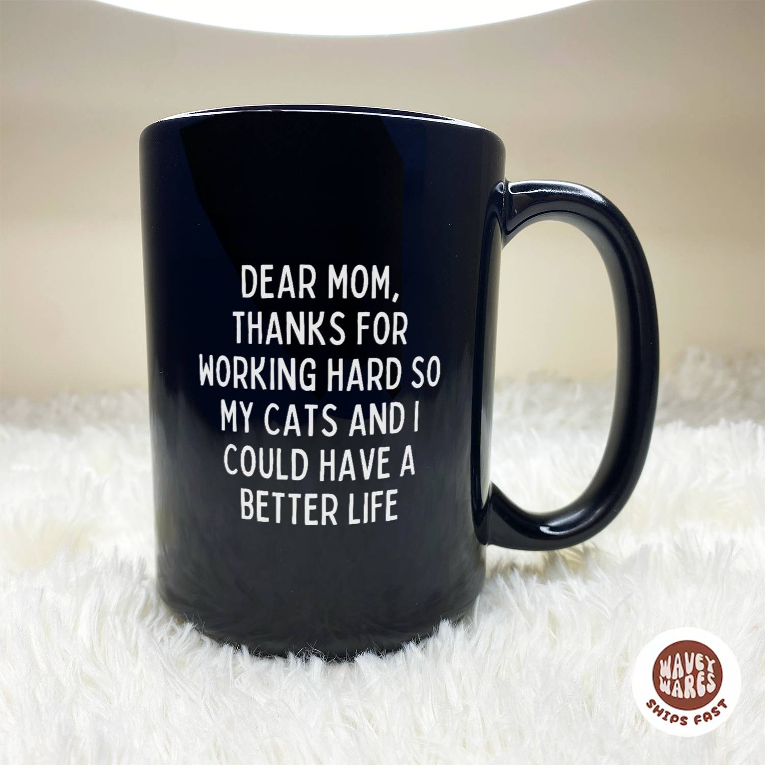 For the mom who juggles bills, responsibilities, and cat food deliveries like a champ. The WaveyWares® Dear Mom, Thanks For Working Hard So My Cats And I Could Have A Better Life Black Mug is the perfect blend of heartfelt and hilarious. Whether you're her proud (and slightly spoiled) child or her beloved fur-grandbaby, this mug is a purr-fect way to show appreciation. A fun gift for cat moms, human moms, or both—because we all know who's really living the good life.