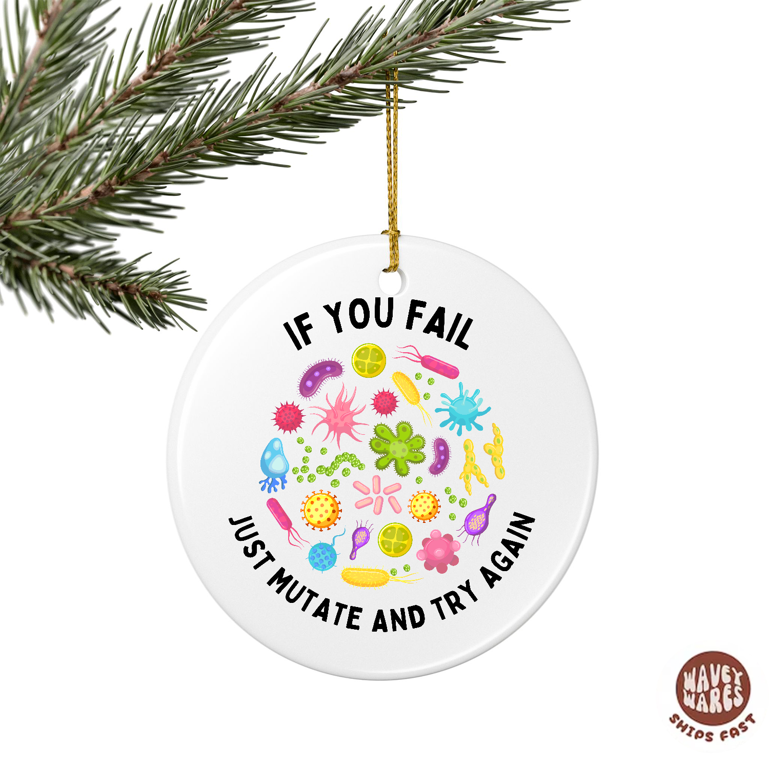 This quirky ornament is perfect for the scientist, researcher, or lab enthusiast in your life who appreciates a good laugh. Featuring the cheeky motto "If You Fail Just Mutate And Try Again," it's an ideal gift for anyone who embraces experimentation, evolution, and the humorous side of scientific discovery. Hang it on your tree, desk, or anywhere you need a reminder that mistakes are just happy accidents waiting to happen. A witty conversation starter that celebrates curiosity and resilience with style.