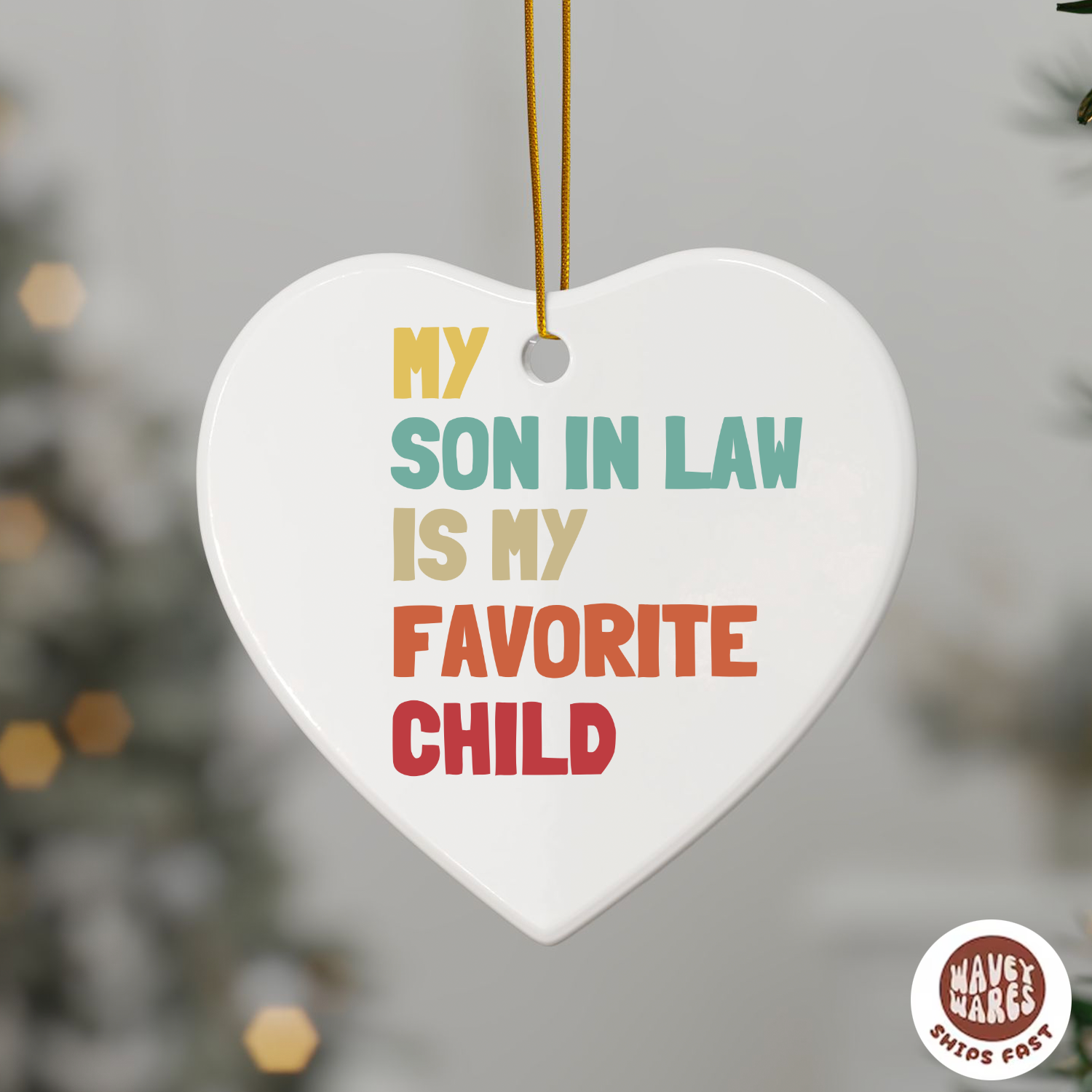 This cheeky ornament is the perfect way to tell your son-in-law he's won the family lottery, with humor and heart. Crafted from quality ceramic and glass, it's a lighthearted keepsake that celebrates the special bond between in-laws while getting a good laugh at the dinner table. Ideal for parents-in-law who've embraced their son-in-law as a true favorite, this witty piece makes a memorable wedding gift or holiday decoration that'll be treasured for years. Hang it proudly and let everyone know you've got a favorite - and it's him!