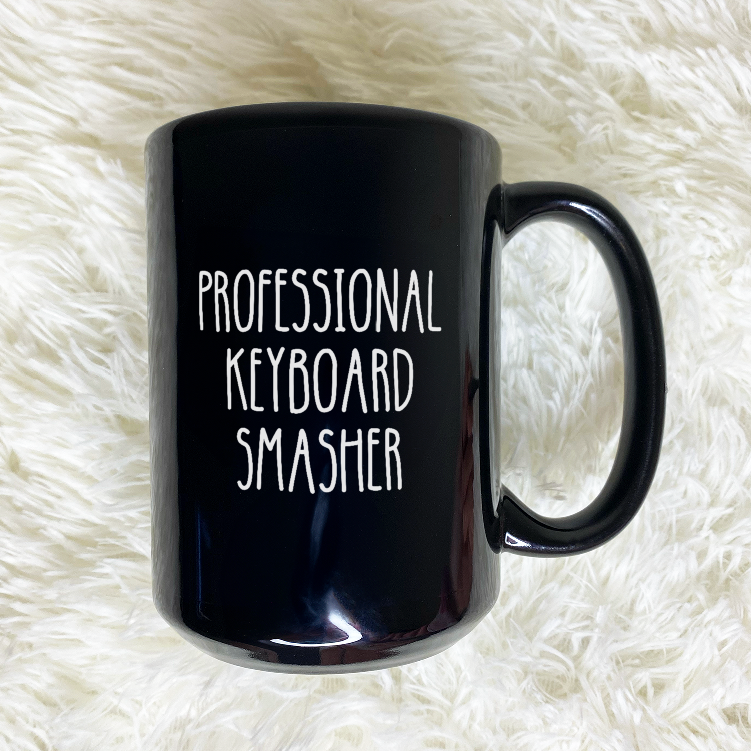 Introducing the WaveyWares® Professional Keyboard Smasher Black Mug - the ultimate office mug for those who take their keyboard smashing skills seriously. With a touch of humor, this mug is perfect for work, your coworkers, or your bestie. Don't settle for a boring mug - smash the workday with style!