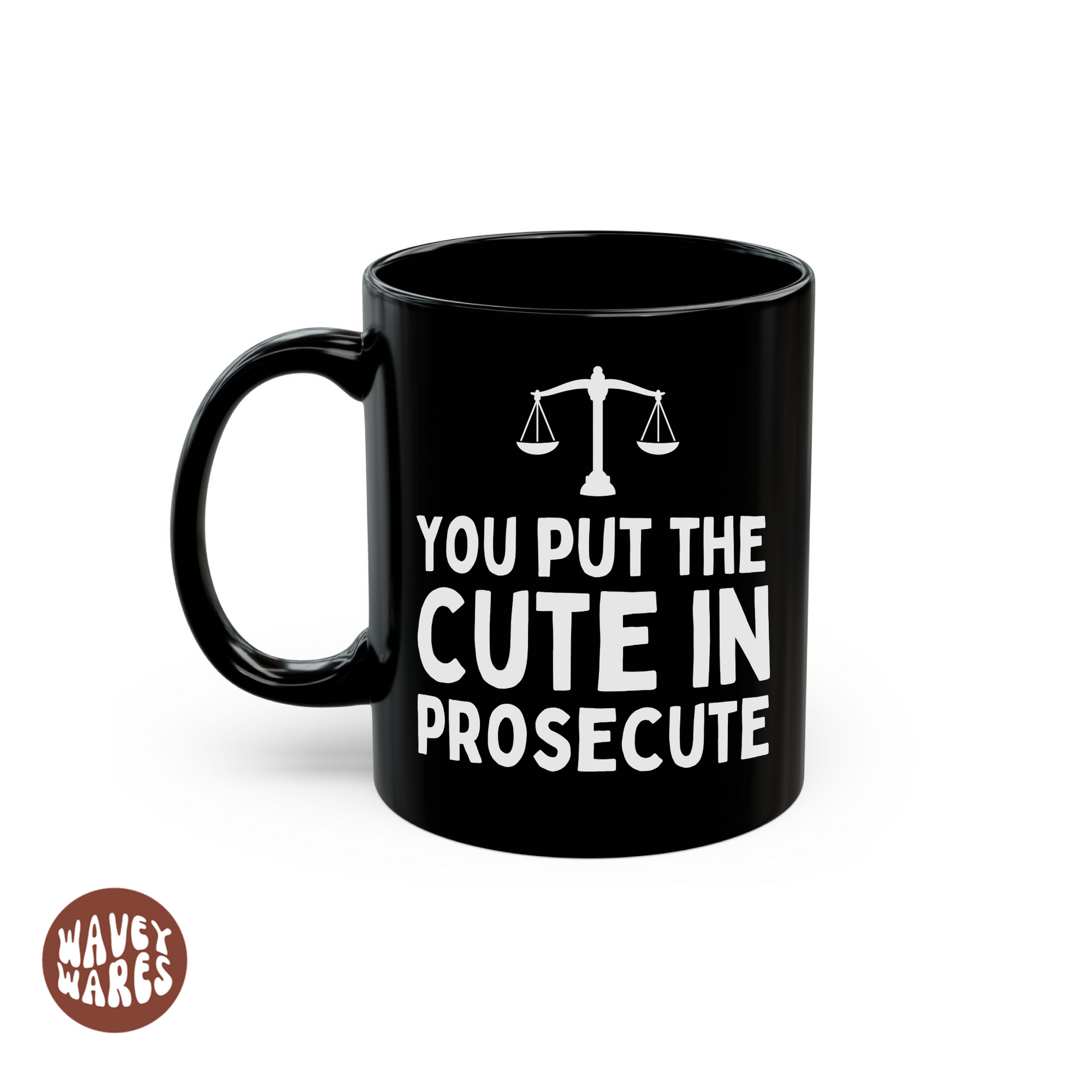 Perfect for the legal eagle in your life, this witty black mug combines humor with everyday practicality. Featuring the cheeky slogan "You Put The Cute In Prosecute," it's an ideal gift for lawyers, barristers, solicitors, and anyone who appreciates courtroom comedy. Whether it's for Valentine's Day, an anniversary, a birthday, or Christmas, this mug brings a smile to morning coffee breaks and desk moments. Durable ceramic construction keeps beverages at the perfect temperature while the bold print remains vibrant through countless washes. A thoughtful present that celebrates their profession with personality.