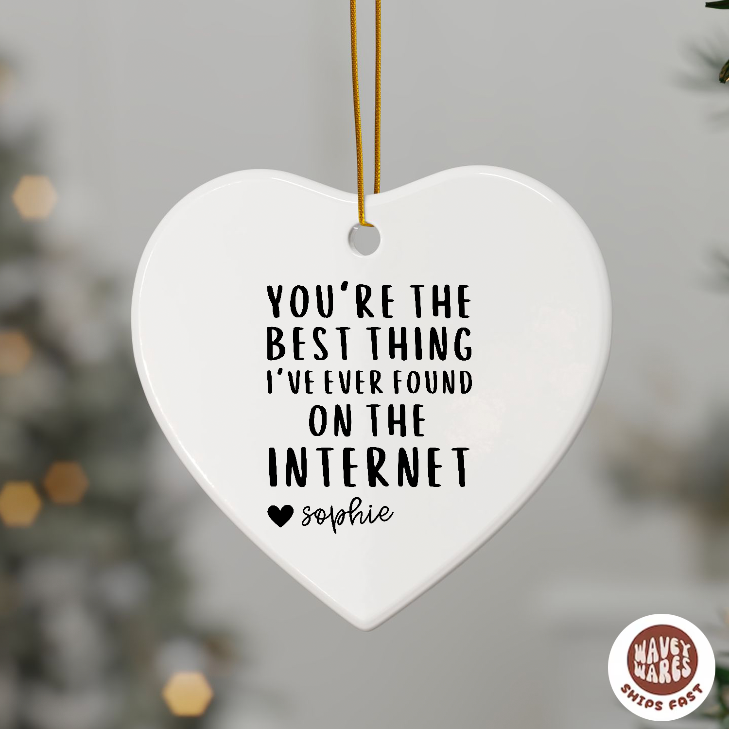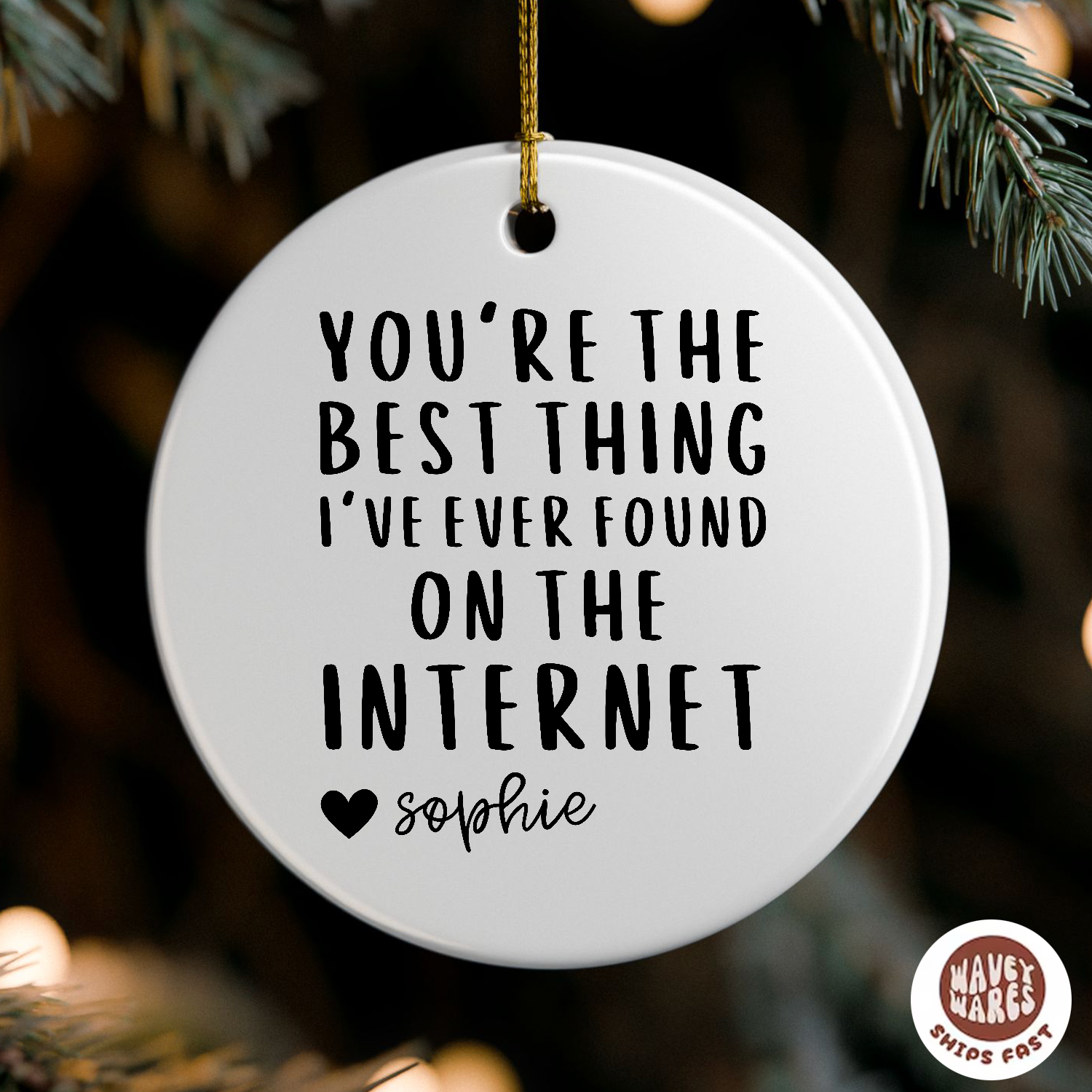 Celebrate your favorite internet connection with this playful personalized ornament. Featuring the heartfelt message, "You're The Best Thing I've Ever Found on The Internet," it’s a whimsical way to show someone special how much they mean to you. Perfect for decorating your home or gifting to a loved one, this ornament adds a touch of fun and affection to any space.